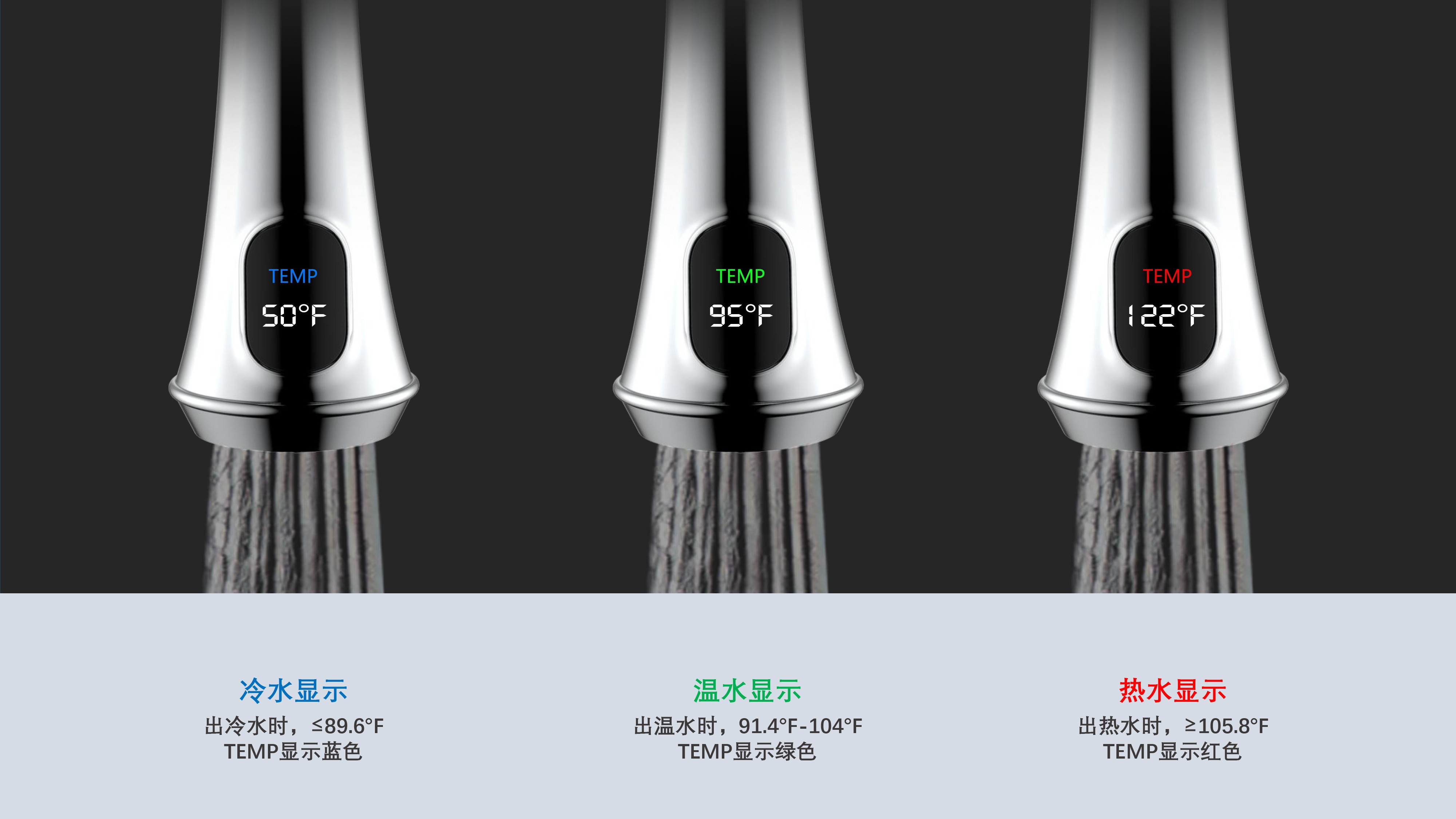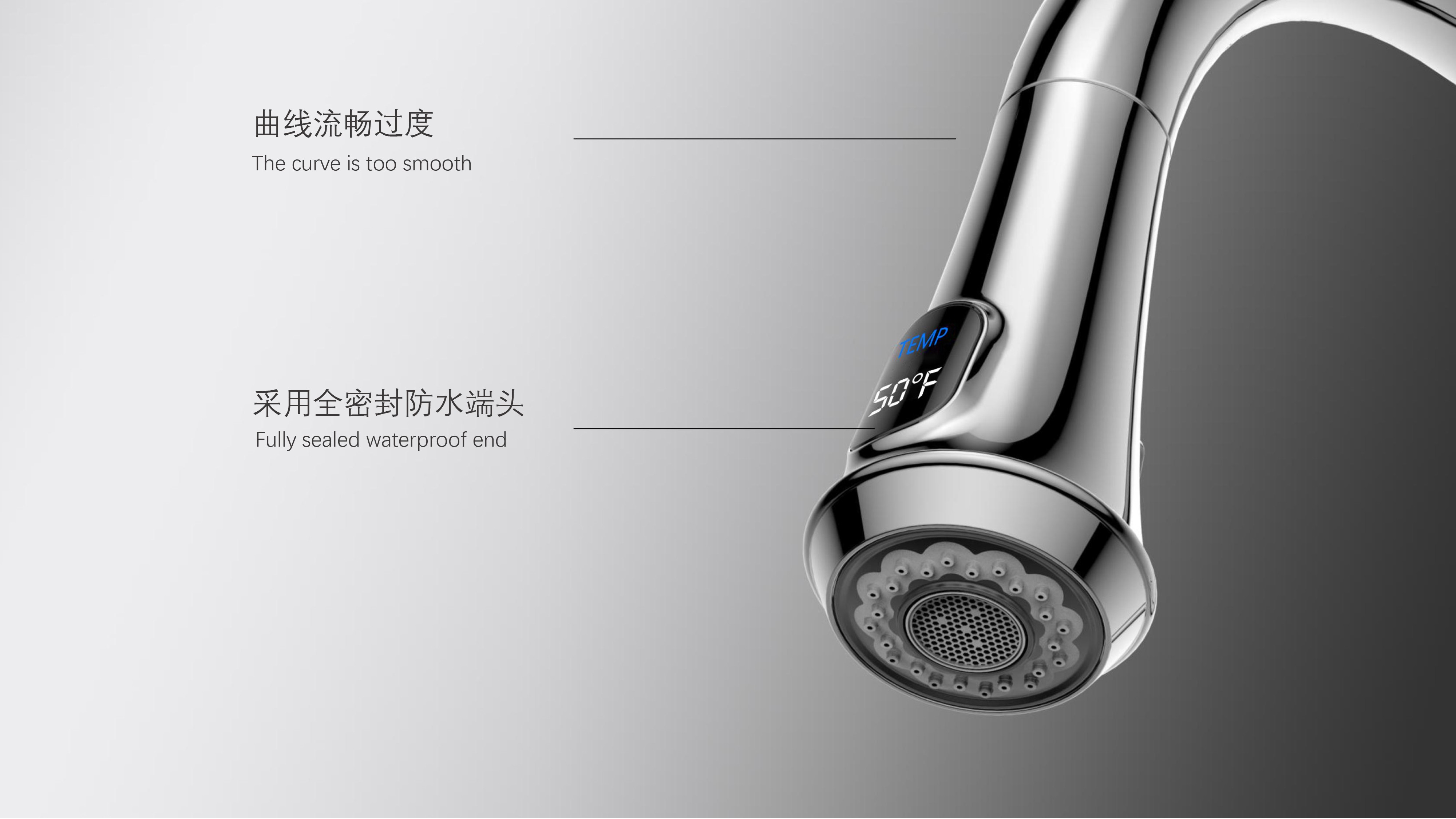 古典廚房龍頭;抽拉頭隨意抽拉多角度使用;采用全密封防水端頭;水力發(fā)電技術(shù),智能芯片溫度數(shù)顯-冷水TEMP顯示藍(lán)色、溫水TEMP顯示綠色、熱水TEMP顯示紅色